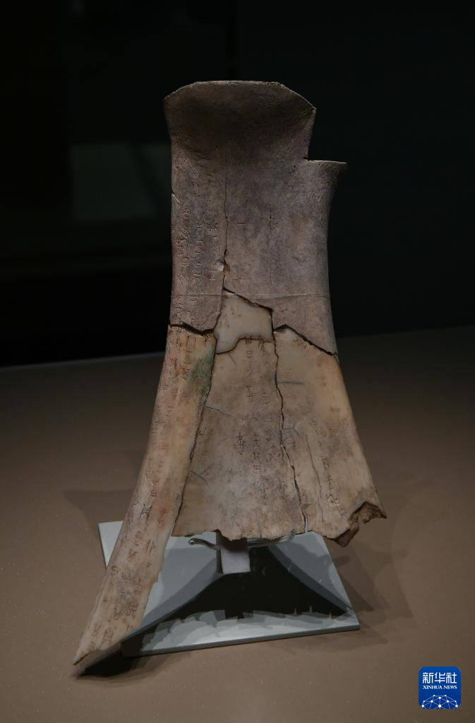 這是在殷墟博物館新館拍攝的1973年安陽小屯出土的刻辭卜骨,是該博物館的鎮館之寶之一(7月1日攝)。