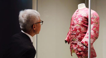 工作人員在河南省禹州市孔家鈞窯的展廳里觀察一件鈞瓷作品(7月2日攝)。