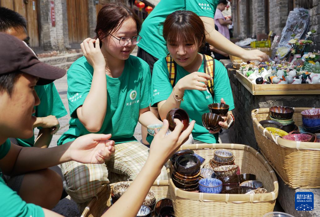 在河南省禹州市神垕鎮,河南農業大學的學生在挑選鈞瓷產品(7月3日攝)。
