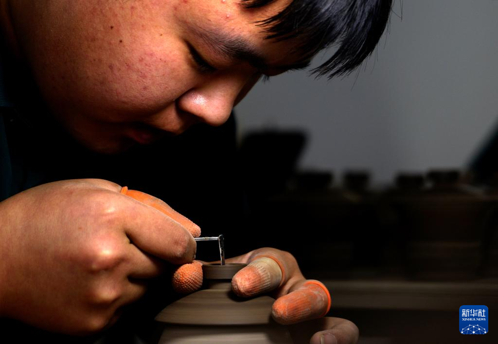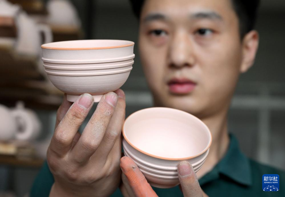 工作人員在河南省禹州市騶虞窯的工作室里檢查鈞瓷素坯質量(7月2日攝)。