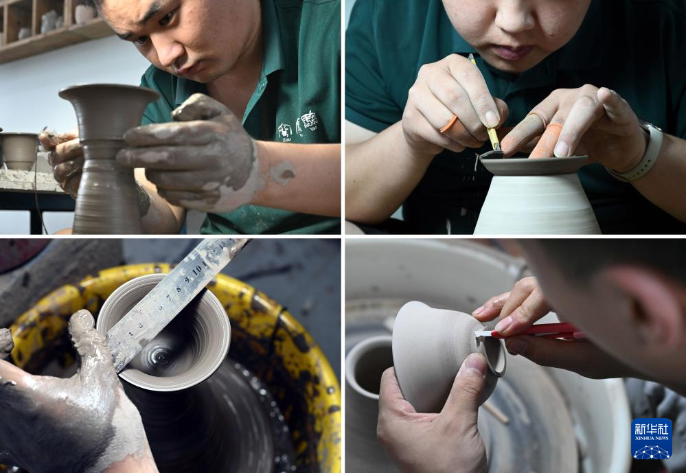 工作人員在河南省禹州市騶虞窯的工作室里進行鈞瓷手工拉坯制作(拼版照片,7月2日攝)。