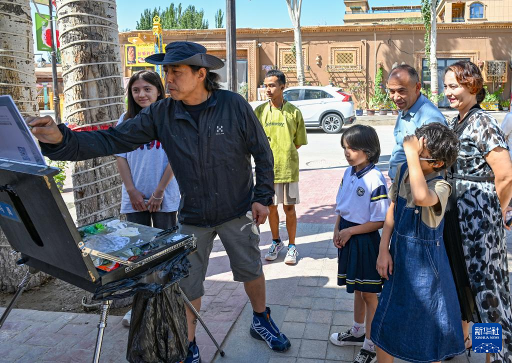 7月6日,在新疆克州阿圖什市松他克鎮阿孜汗村,村民在圍觀小分隊文化志愿者寫生創作。