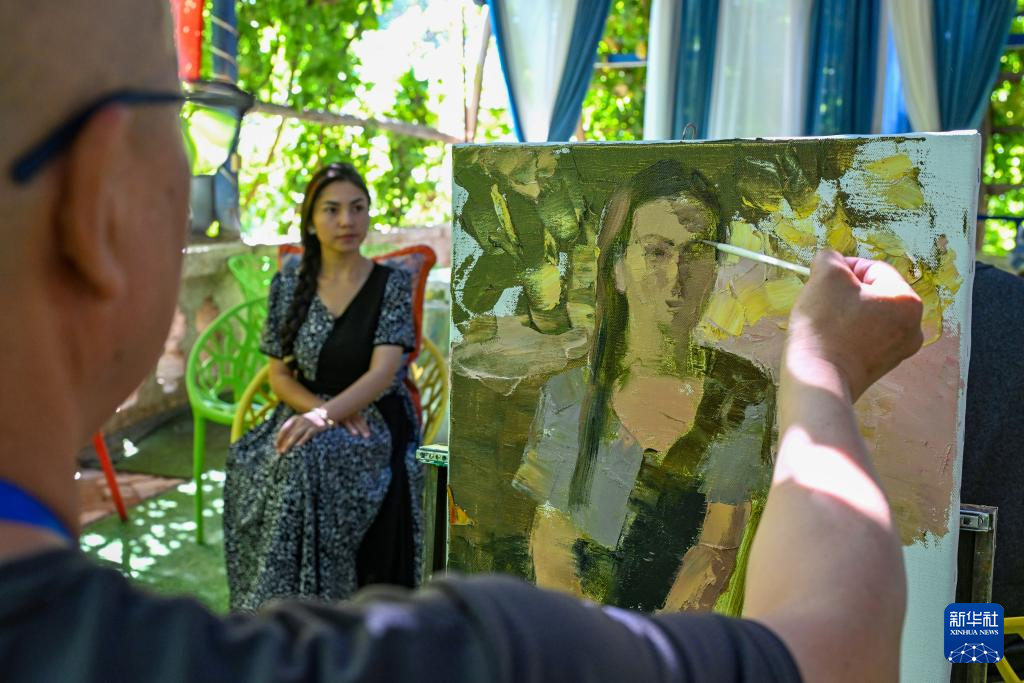 7月6日,在新疆克州阿圖什市松他克鎮阿孜汗村,小分隊文化志愿者在寫生創作。