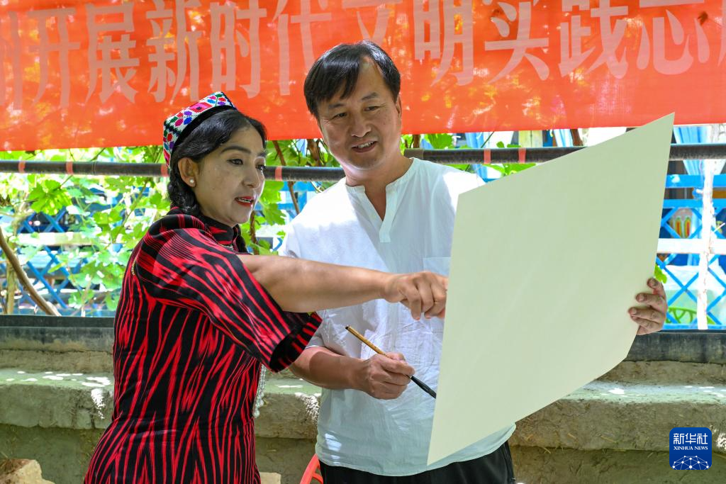 7月6日,在新疆克州阿圖什市松他克鎮阿孜汗村,小分隊文化志愿者創作后與模特交流。