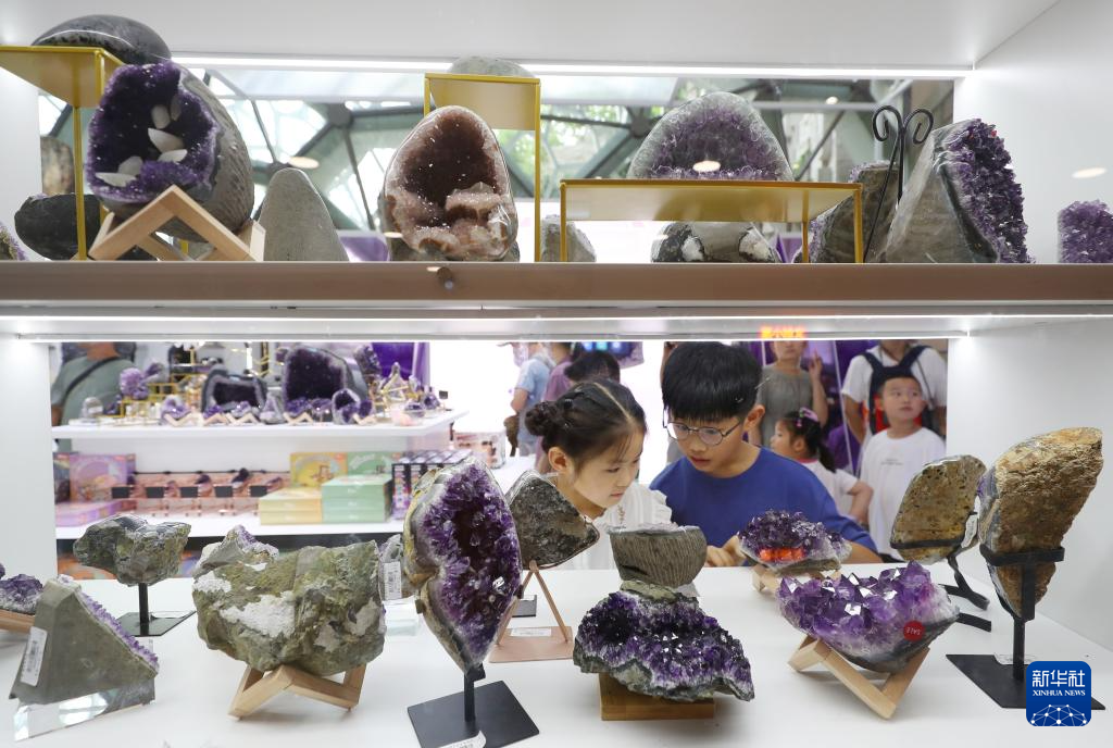 7月16日,參觀者在一組產自巴西的瑪瑙外殼紫水晶球體展品前駐足觀看。