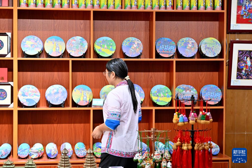 在廣西三江侗族自治縣一家非遺文創超市,侗族農民畫作者在整理農民畫文創產品(7月30日攝)。
