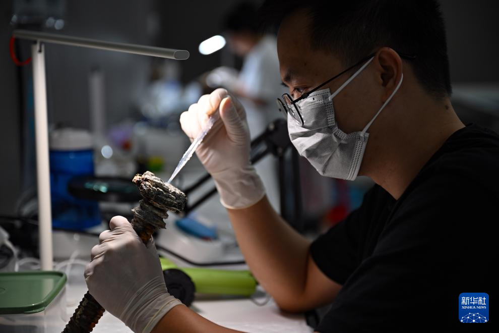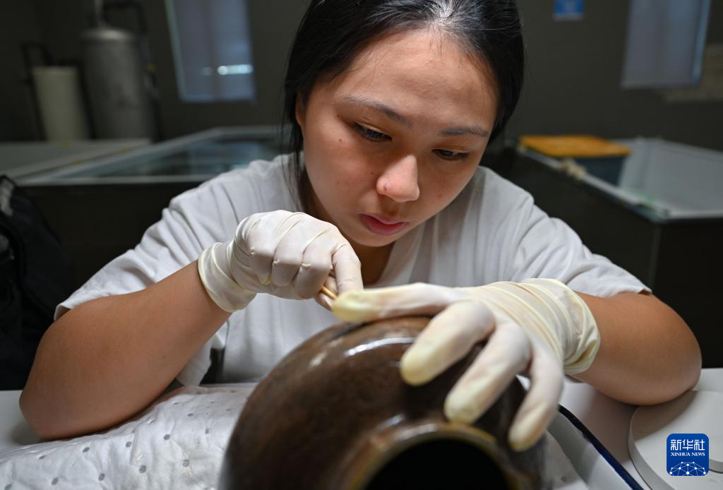 8月27日,中國(海南)南海博物館的工作人員顏建超在修復文物。