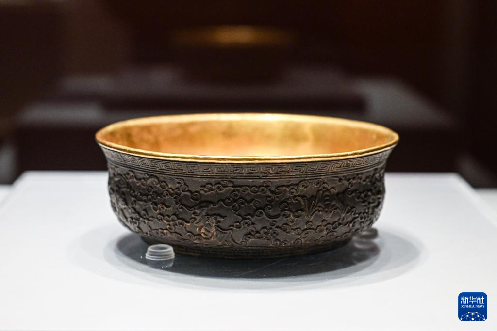 8月31日在海南省博物館拍攝的“物華天寶 黎海瓊珍——故宮博物院藏海南文物特展”展出的清代椰子木雕云蝠紋鑲金里碗。