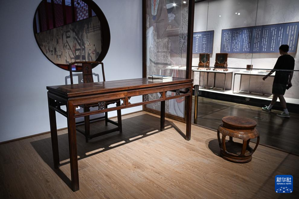 8月31日在海南省博物館拍攝的“物華天寶 黎海瓊珍——故宮博物院藏海南文物特展”展出的清代黃花梨木椅、黃花梨木畫桌和黃花梨木雕花紋圓杌。