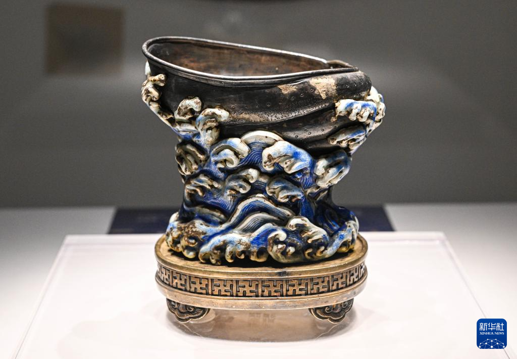 8月31日在海南省博物館拍攝的“物華天寶 黎海瓊珍——故宮博物院藏海南文物特展”展出的清代乾隆款銀燒藍海螺式水丞。