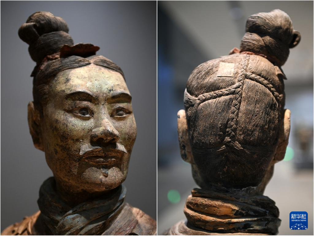 這是在秦始皇帝陵博物院展出的綠面跪射俑(正反面拼版照片,9月8日攝)。