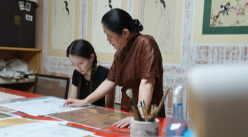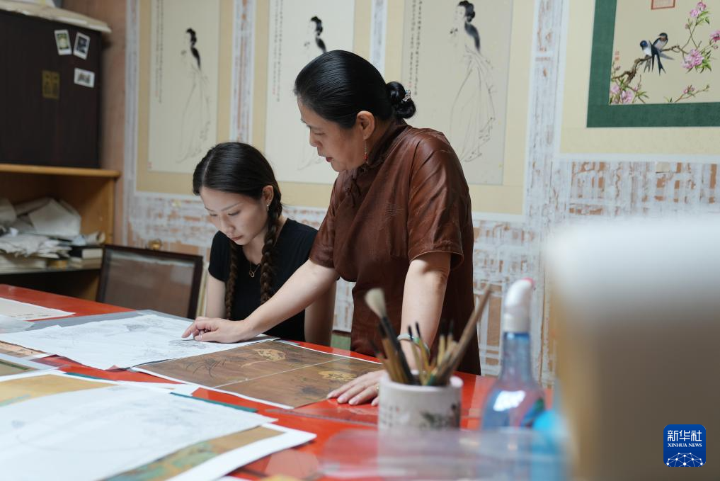 9月25日,在“觀繡園”傳習所內,盧建英(右)在向女兒潘乃舒講解勾線方法。
