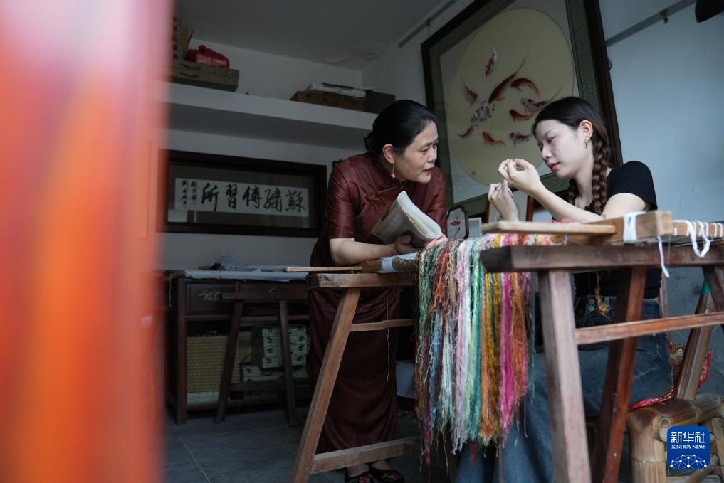 9月25日,在“觀繡園”傳習所內,盧建英(左)和女兒潘乃舒交流蘇繡技藝。