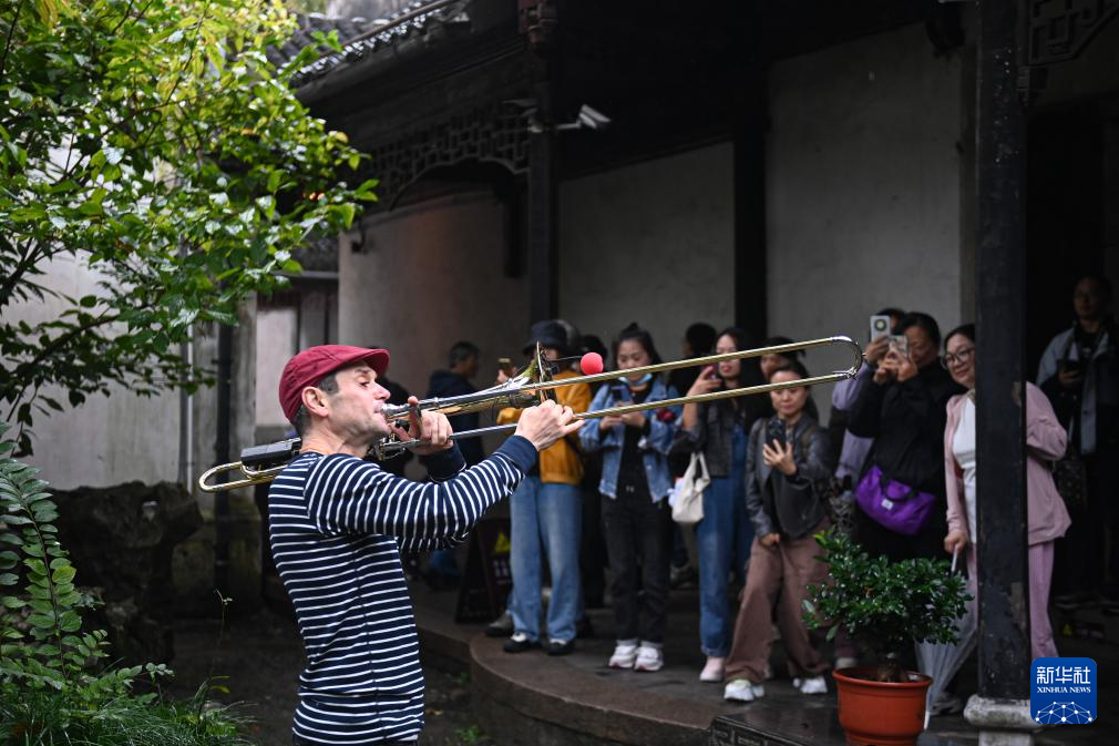 10月27日,來自瑞典的藝術表演者在南潯古鎮小蓮莊為游客演繹互動音樂會。
