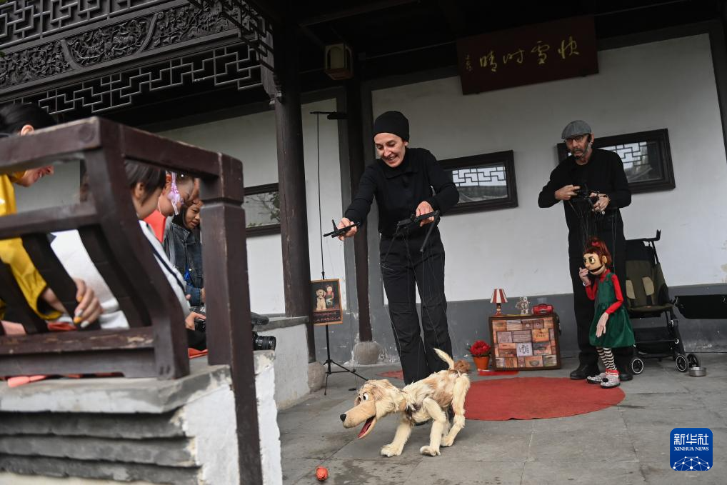 10月27日,來自意大利的藝術表演者在南潯古鎮宜園為游客表演輕喜偶劇。