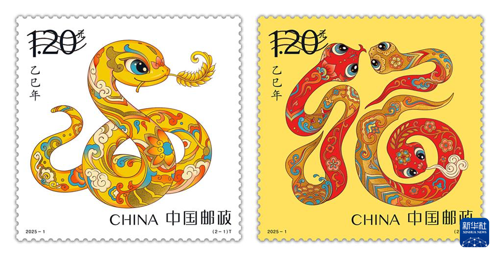 《乙巳年》特種郵票一套兩枚,郵票圖名分別為“蛇呈豐稔”和“福納百祥”,以敦煌壁畫和傳統民俗為靈感來源,將蛇的形象與吉祥寓意巧妙結合,既體現了生肖文化的獨特魅力,又凝聚了樸素靈活的民間智慧。