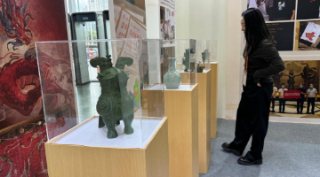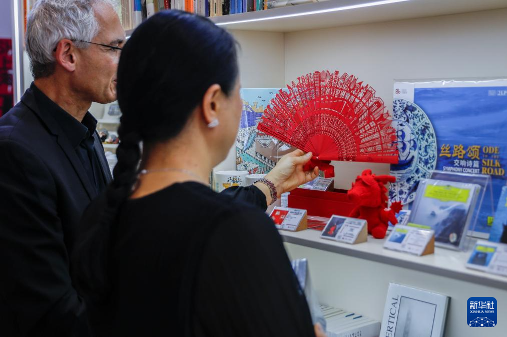 11月4日,在新聞中心進行音樂表演的中外藝術家演出結束后觀看展出的文創產品。