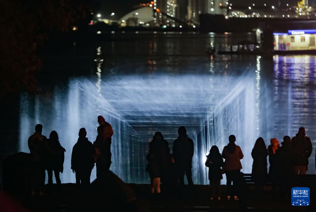 11月9日,在加拿大溫哥華舉辦的燈光節上,人們觀賞一個使用全息投影創作的燈光裝置。