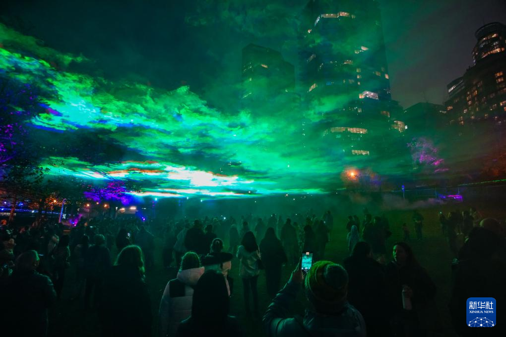 11月9日,在加拿大溫哥華舉辦的燈光節上,人們觀賞一個模擬極光的燈光裝置。