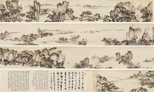中國近現代及當代書畫部分將呈現1000余件書畫佳作,分列五個專場?!按笥^”夜場,將呈現逾百件珍品佳構,顯赫來源佳作祥集。梅潔樓珍藏溥儒《江山無盡》卷堪為溥氏手卷第一,高頭大卷,長逾十米,為渡海后回望故國潛心之作。