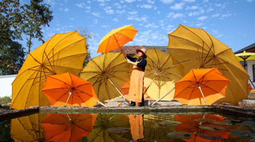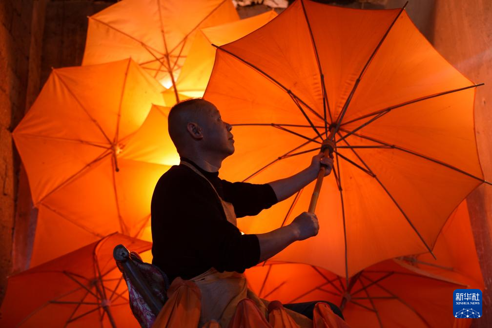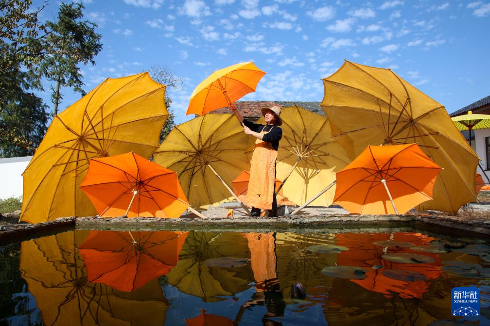 11月13日,在涇縣昌橋鄉孤峰村,國民油布傘廠的工人在晾曬油布傘。