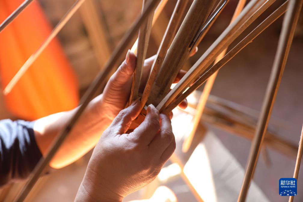 11月13日,在涇縣昌橋鄉孤峰村,國民油布傘廠的工人在制作傘骨。