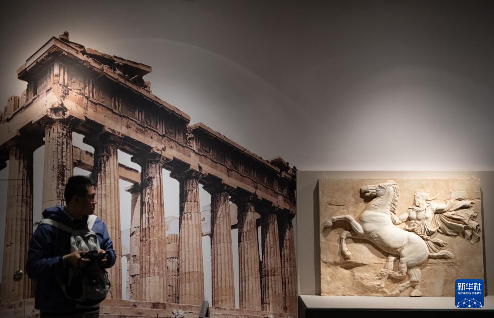 11月20日,一名參觀者在觀看來自希臘衛城博物館的藏品帕臺農神廟西側的八號浮雕帶(石膏復制品)。