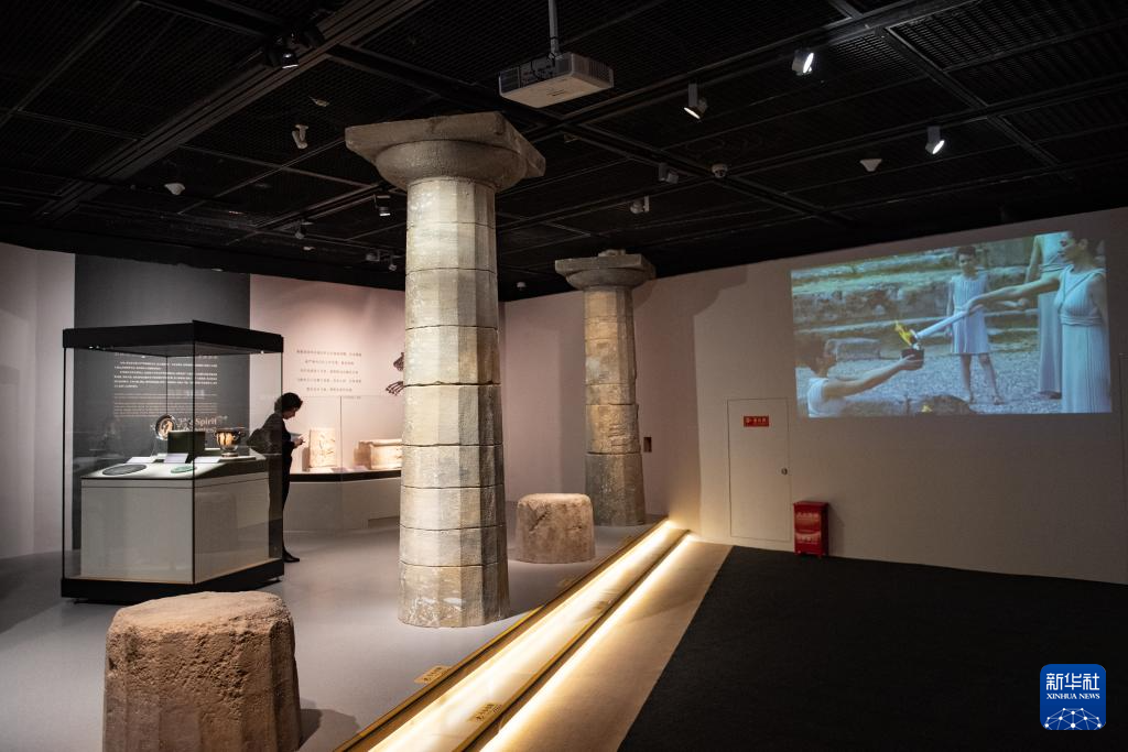 這是11月20日拍攝的“希臘人——從阿伽門農到亞歷山大”展廳一角,這里在播放2008年在希臘奧林匹亞舉辦的北京奧運圣火取火儀式視頻。
