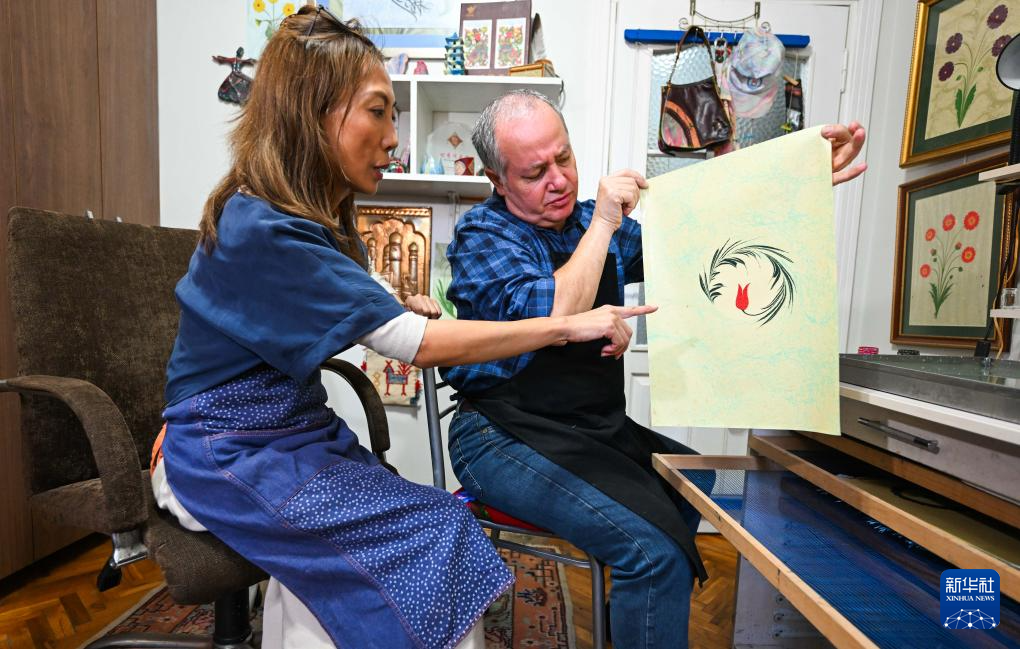 11月1日,在土耳其伊斯坦布爾,李昕桐(左)在老師埃羅爾的家中請教水拓畫相關問題。