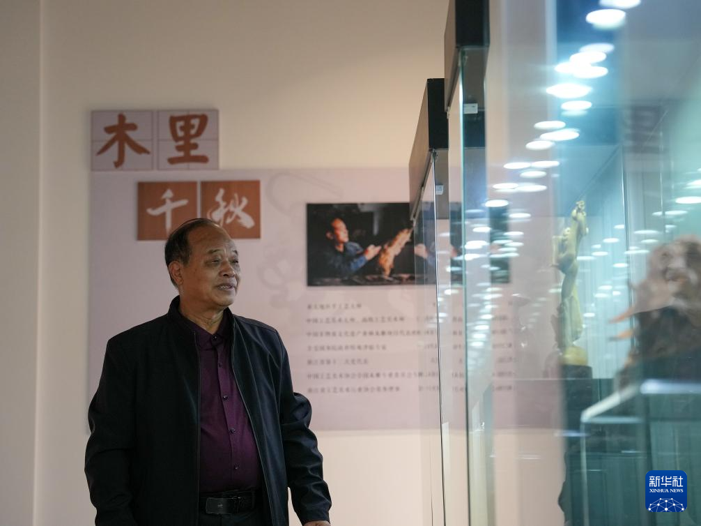 虞金順在藝術館觀看自己創作的樂清黃楊木雕作品展覽(11月25日攝)。
