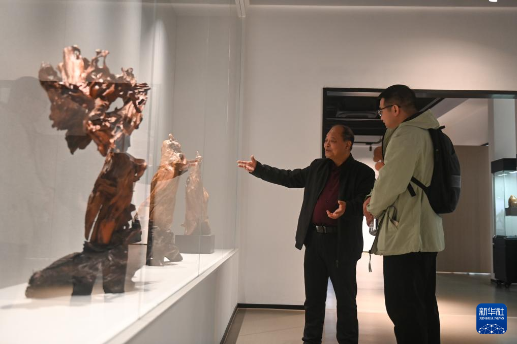 虞金順(左)在藝術館展示介紹自己創作的樂清黃楊木雕作品(11月25日攝)。