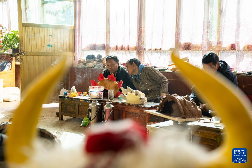 12月9日,西洛(左一)和同事交流西藏傳統面具制作心得。