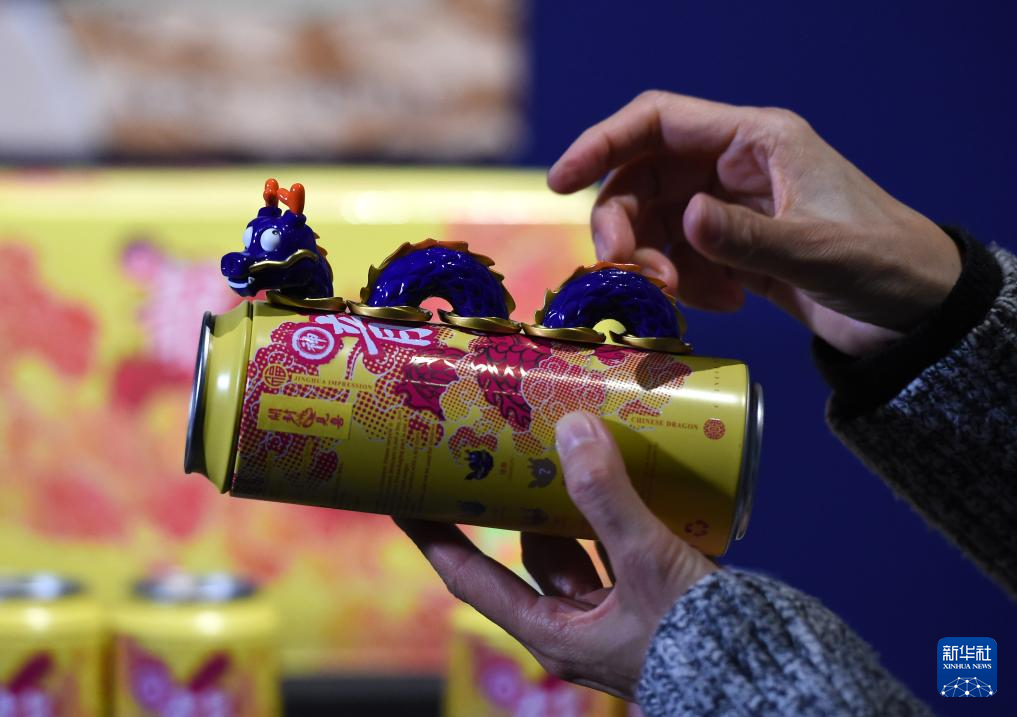 12月14日,觀眾在欣賞現場展示的一款龍形組合冰箱貼。