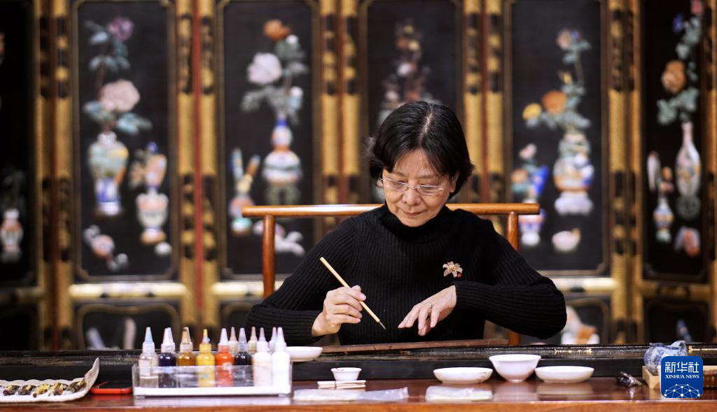 胡昕在工作室內創作金漆鑲嵌作品(12月10日攝)。