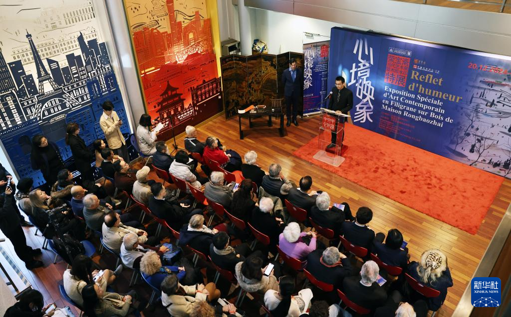 這是12月20日在法國巴黎中國文化中心拍攝的“心境映象——榮寶齋當代藝術展暨木版水印特展”開幕式現場。