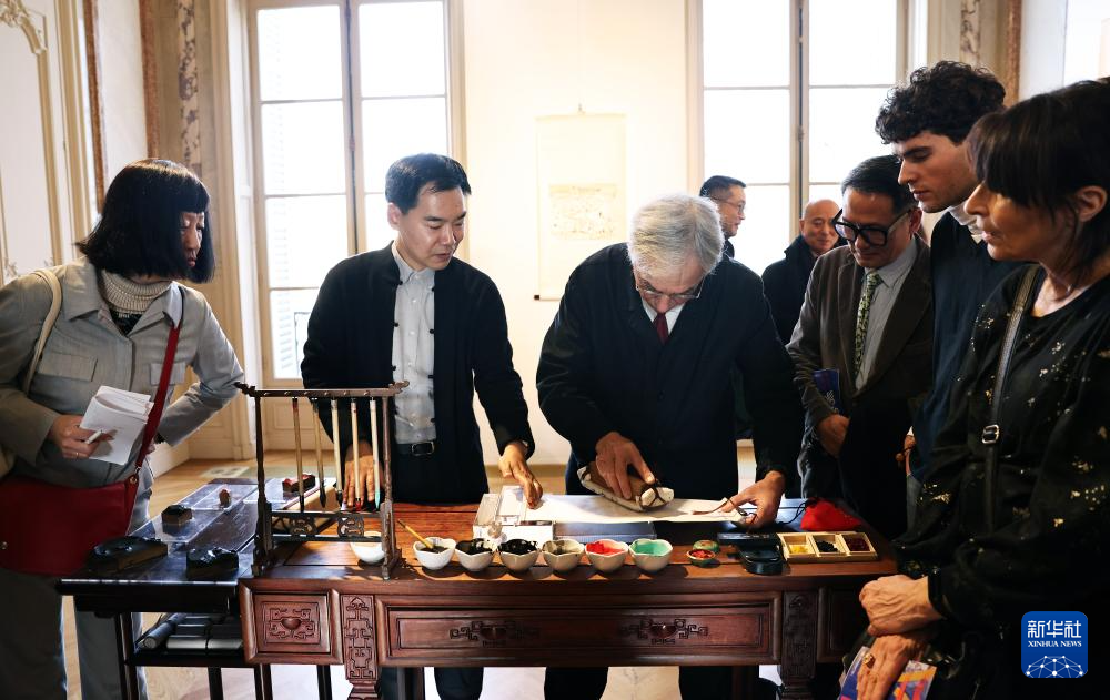 12月20日,在法國巴黎中國文化中心,嘉賓在“心境映象——榮寶齋當代藝術展暨木版水印特展”上體驗木版水印制作技藝。