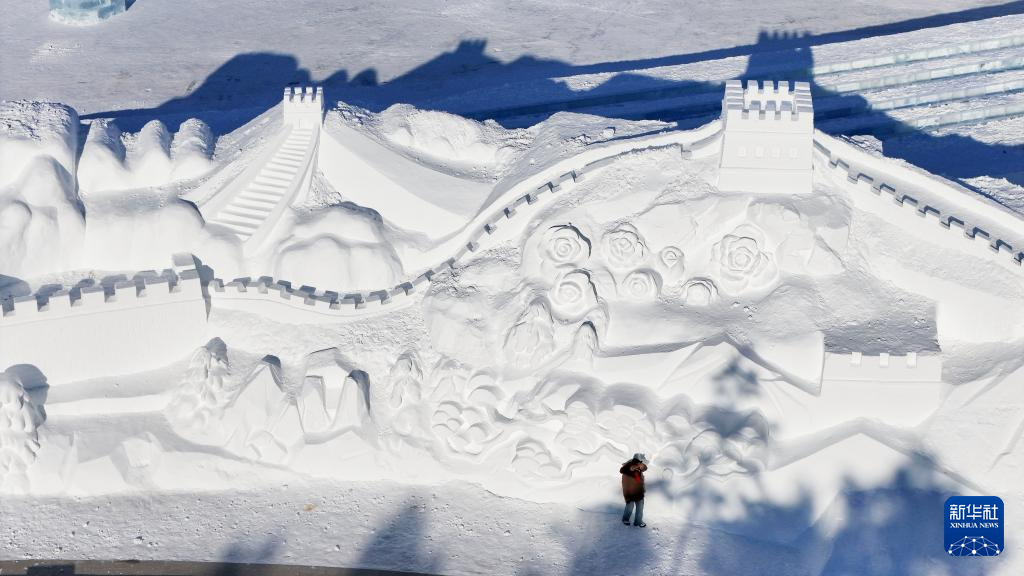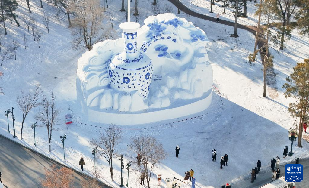 12月23日,人們在第37屆太陽島國際雪雕藝術博覽會上游覽(無人機照片)。