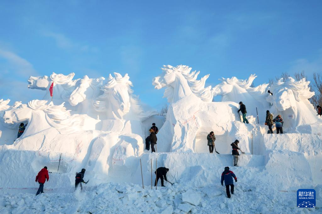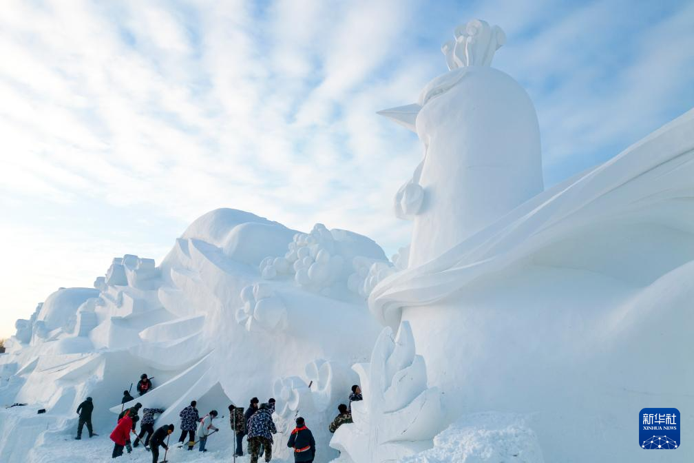 12月23日,雕刻師在哈爾濱太陽島雪博會園區創作大型雪雕(無人機照片)。
