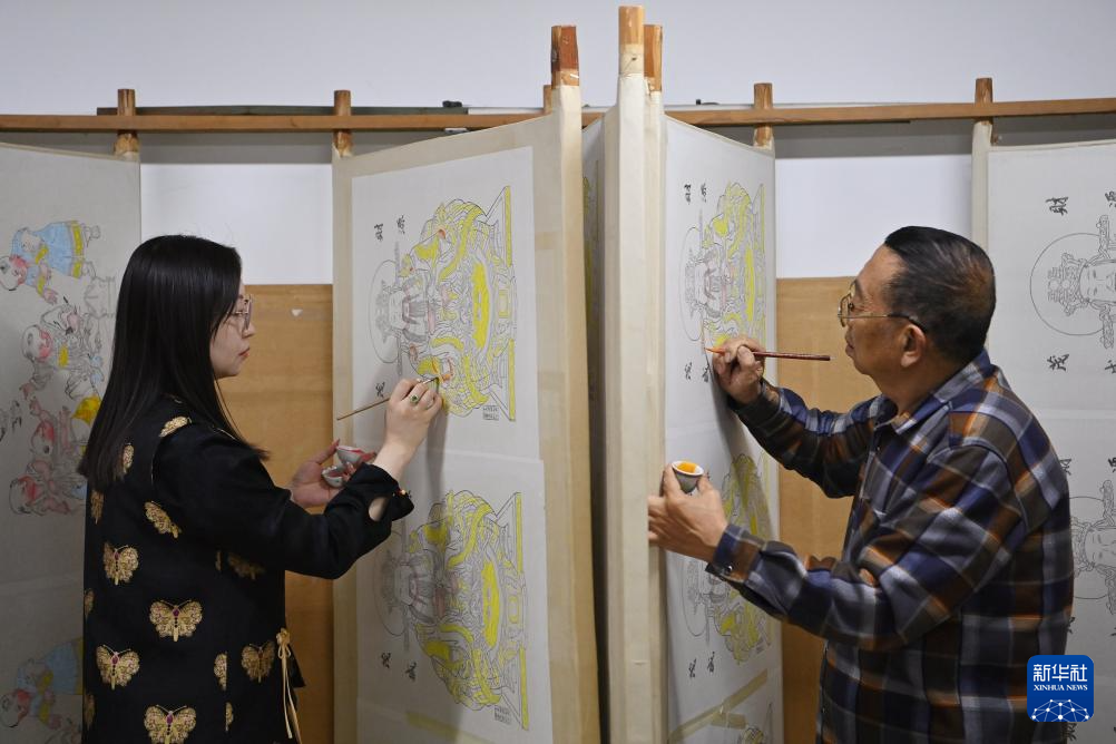 12月25日,“玉成號”年畫坊的畫師在繪制楊柳青木版年畫。