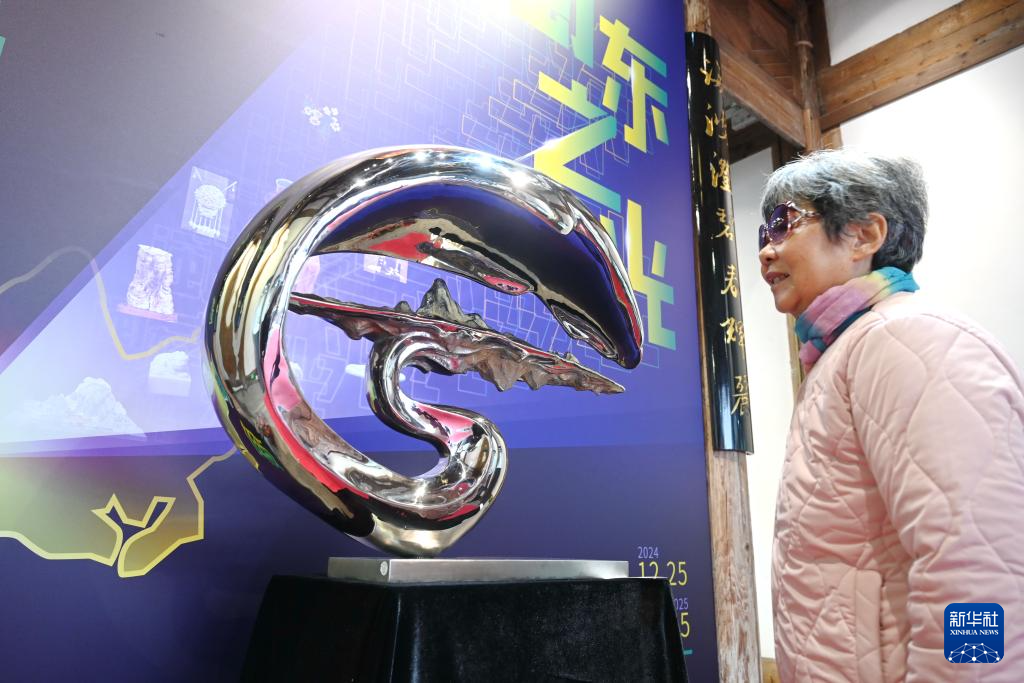 12月25日,觀眾在福建省海峽民間藝術館觀賞不銹鋼材質工藝作品《海納百川》。