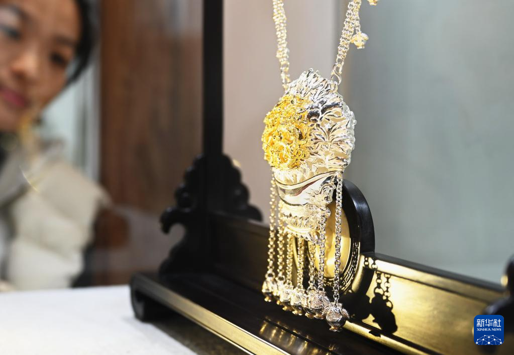 12月25日,觀眾在福建省海峽民間藝術館觀賞畬族銀器飾品《龍翰鳳翼》。