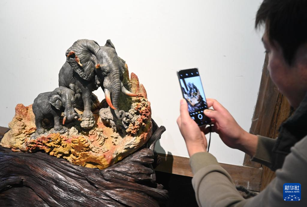 12月25日,觀眾在福建省海峽民間藝術館拍攝雕刻作品《瑞象輝澤》。