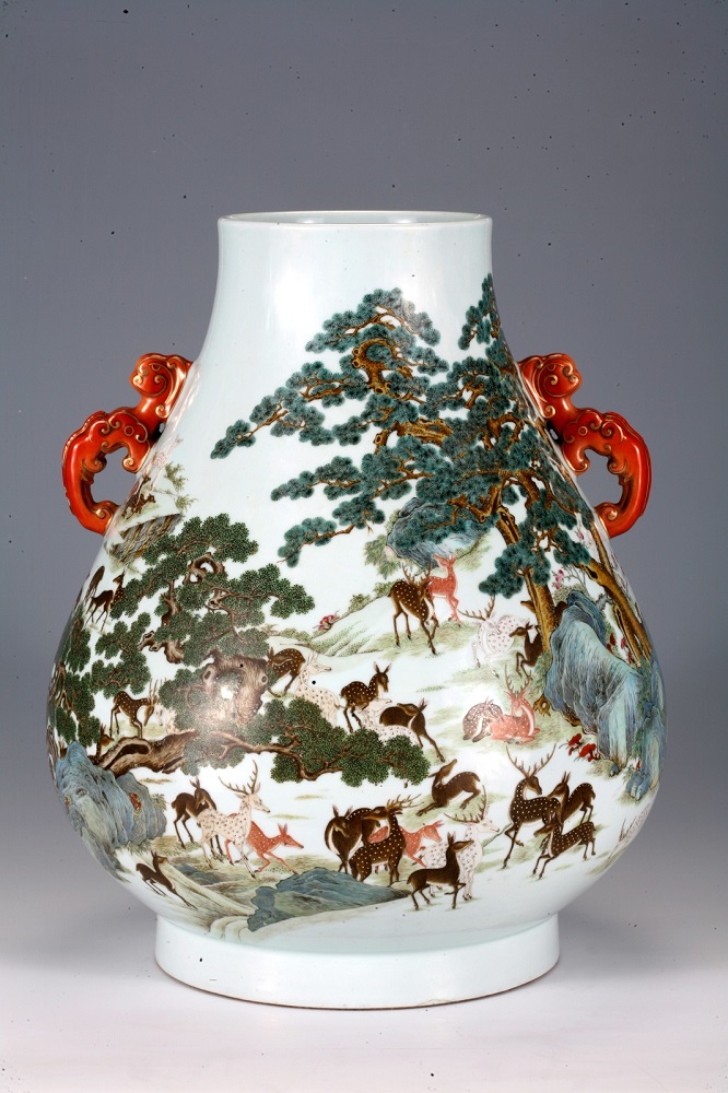展出的“清乾隆款粉彩雙鳳耳百鹿尊”。(沈陽故宮博物院供圖)