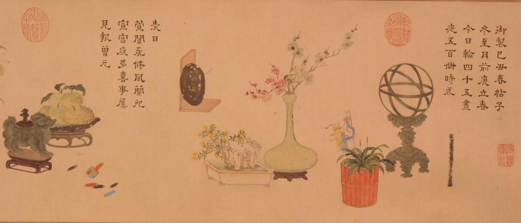 展出的“清董邦達書畫御制己丑春帖子圖卷”局部。(沈陽故宮博物院供圖)