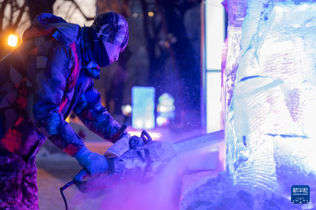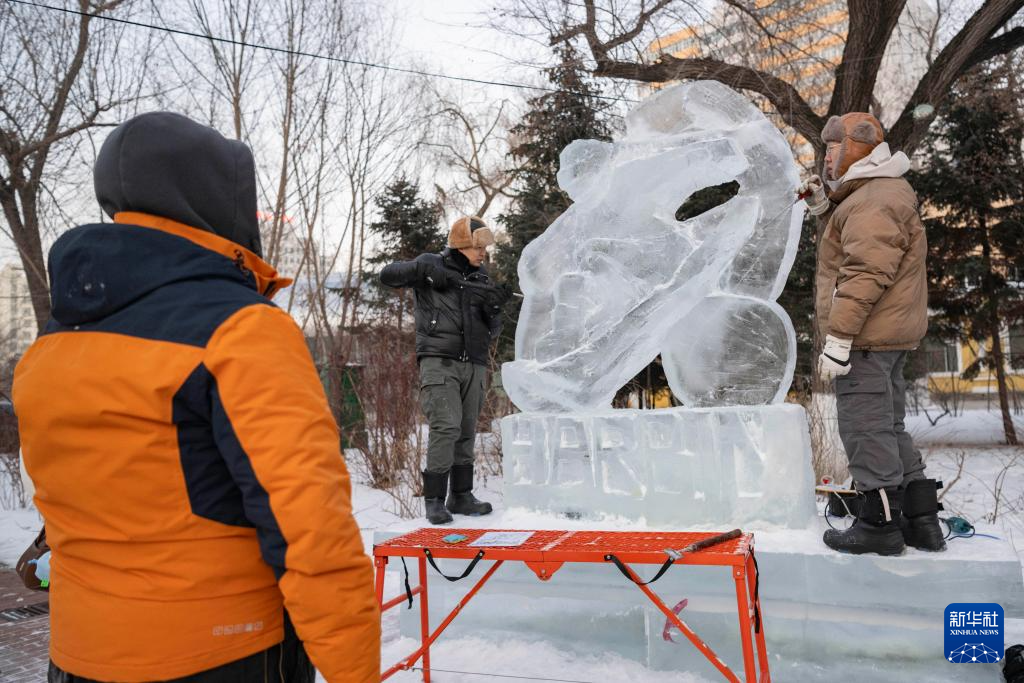 1月2日,在哈爾濱市道里區,冰雕師在兆麟公園內雕琢2025年哈爾濱亞冬會主題冰雕作品。