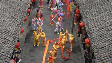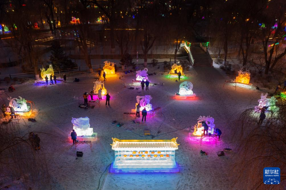 1月7日,在哈爾濱市兆麟公園,冰雕師們在雕琢冰雕作品(無人機照片)。
