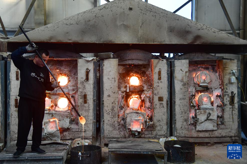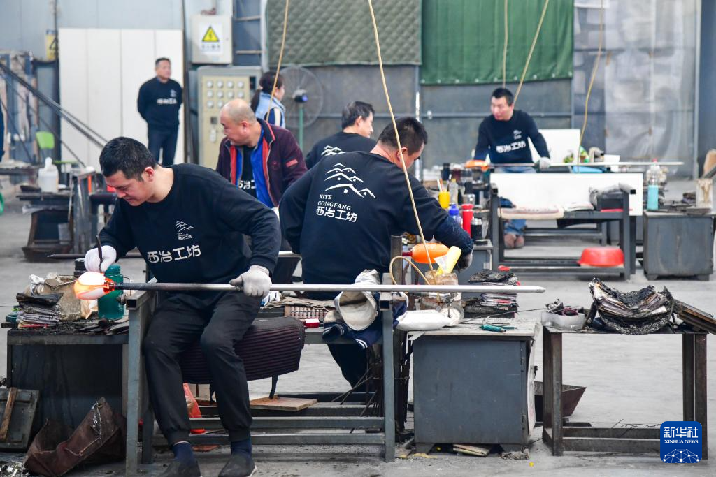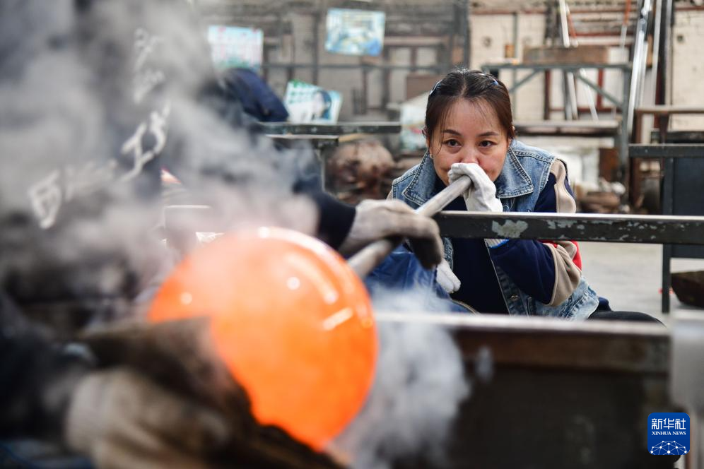 1月9日,在淄博市博山區的西冶工坊,工匠在加工琉璃工藝品。
