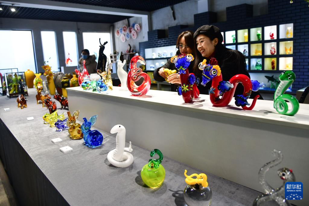 1月9日,消費者在淄博市博山區西冶工坊展銷廳內挑選蛇年主題琉璃工藝品。