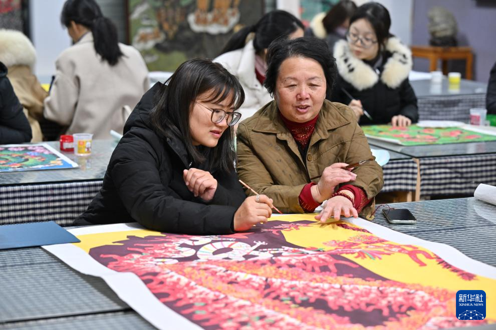 1月10日,漳平市農民畫院副院長、“福建農民畫”非遺項目省級傳承人王秀珍(右)向前來學習農民畫的學員傳授繪畫技藝。