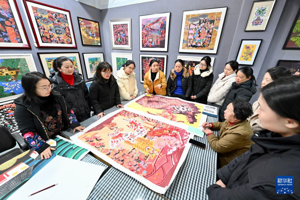 1月10日,漳平市農民畫院院長、“福建農民畫”非遺項目省級傳承人吳玉環(左五)向前來學習農民畫的學員傳授繪畫技藝。